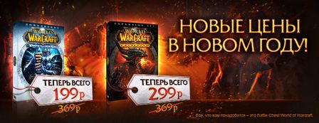Официальный сайт сообщества сообщает, что ещё одним подарком к новому году станет снижение цен на дополнения для World of Warcraft. Теперь вы сможете приобрести дополнение Wrath of the Lich King за 199 рублей, а Cataclysm – за 299! Также полный комплект будет стоить 649 рублей!